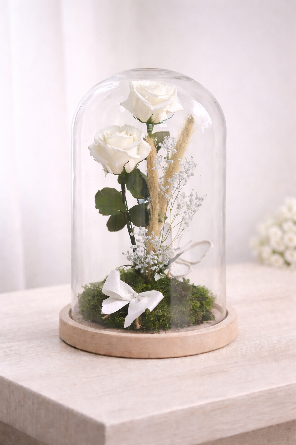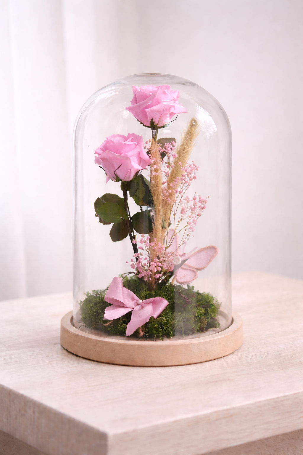 "Cúpula del amor, compuesta por dos rosas preservadas y sus atrezzos."