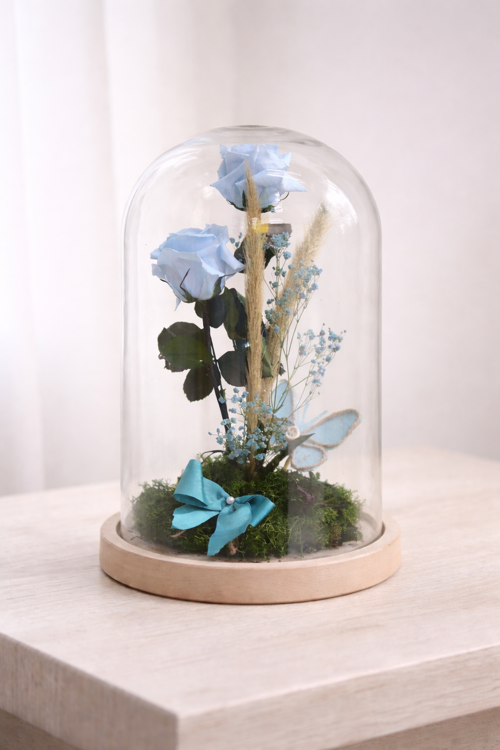 La flor preservada o liofilizada, son flores naturales tratadas, de tal forma que puedes disfrutar de tus flores durante muchísimo tiempo. Es aconsejable mantenerlas en un recipiente cerrado para conservar su estado y color.