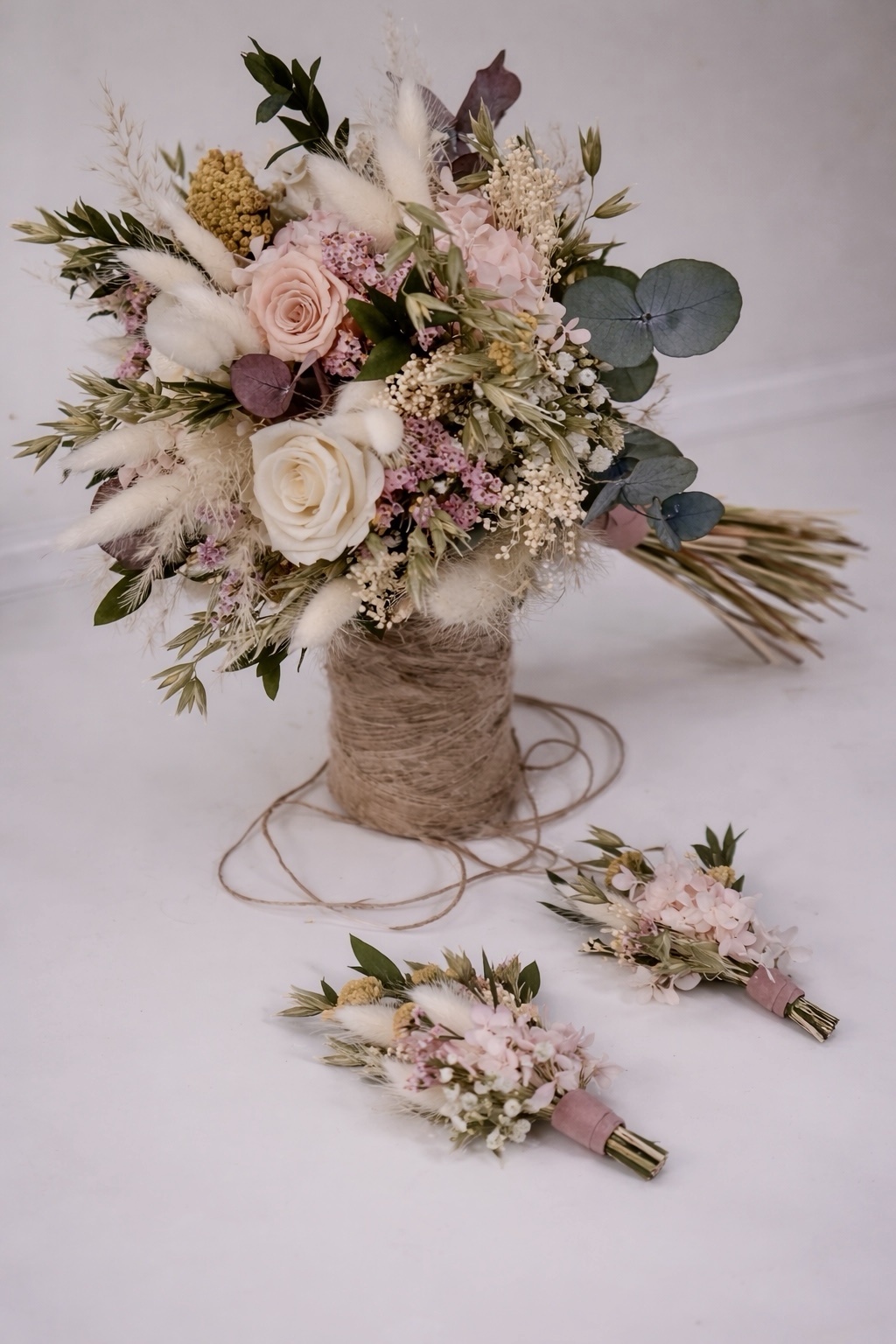 Divertido, juvenil y desenfadado, elaborado con flor seca y preservada, son flores que duran en el tiempo, tonalidades rosados y pastel, con hortensias, rosas espigas entre otras flores y verdes.