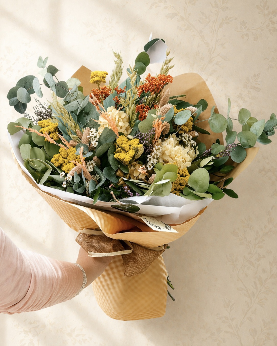 Ramo floral, elaborado con flor preservada y seca. Hortensia, paniculata, eucalipto, lagurus.