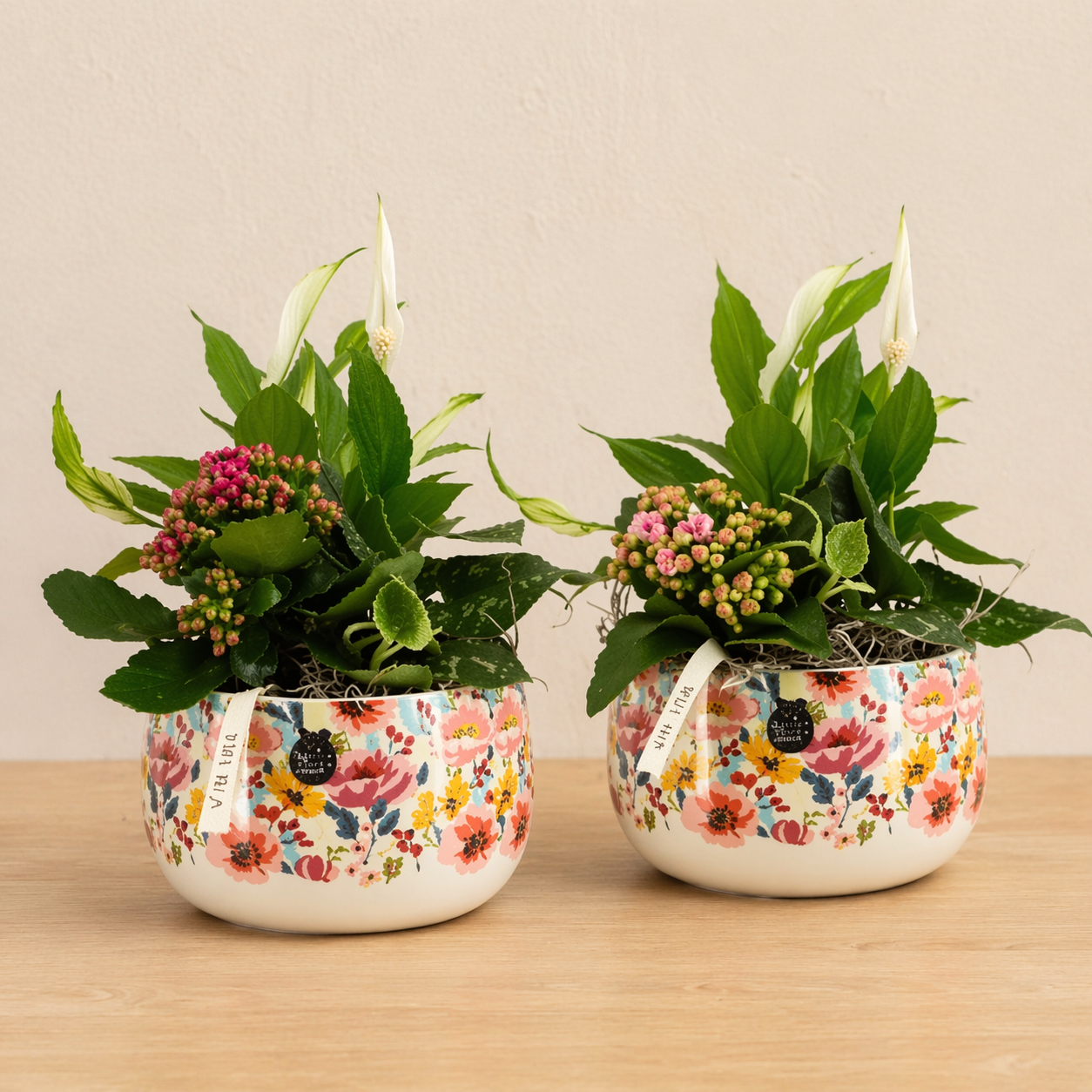Centro de plantas naturales compuesto por spathiphyllum (flor blanca) y kalanchoe en tonos rosados, presentado en maceta cerámica con diseño floral.
