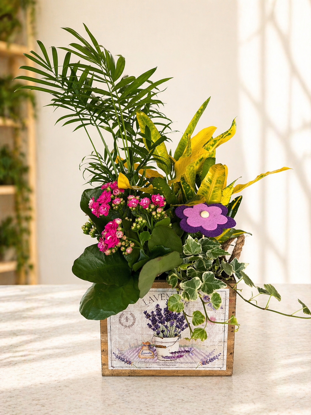 Este jardín combina diferentes variedades como kalanchoe en flor, plantas verdes decorativas y follaje variado, creando una pieza completa, equilibrada y lista para colocar. No es una planta suelta, es un conjunto que funciona por sí solo.