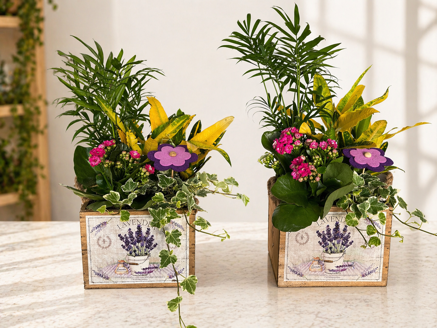 Centro de plantas naturales en composición, presentado en caja decorativa con diseño floral, ideal para aportar volumen, color y textura a cualquier espacio.