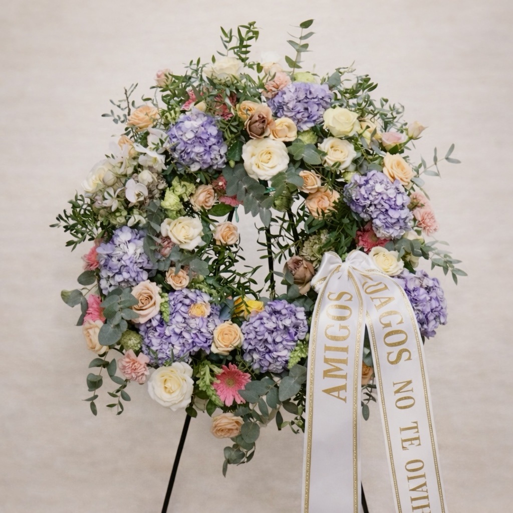 Corona de flores con tonalidades suaves, fina y delicada, todo el aro está elaborado con flor muy especial, rosas, hortensias, peorías, flor de temporada. Puedes pedirnos más información, tenemos nuestro teléfono habilitado de forma permanente dada la situación.