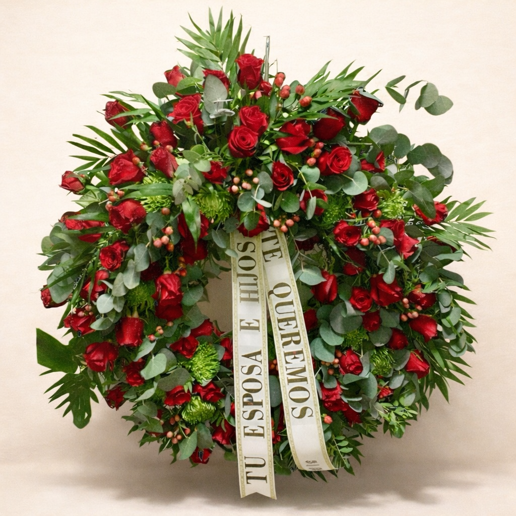 Corona con rosas rojas y verdes ornamentales, todo el aro está elaborado con rosas como la foto, si el color de la rosa se desea en otro tono contacte con la floristería para consultar disponibilidad.
