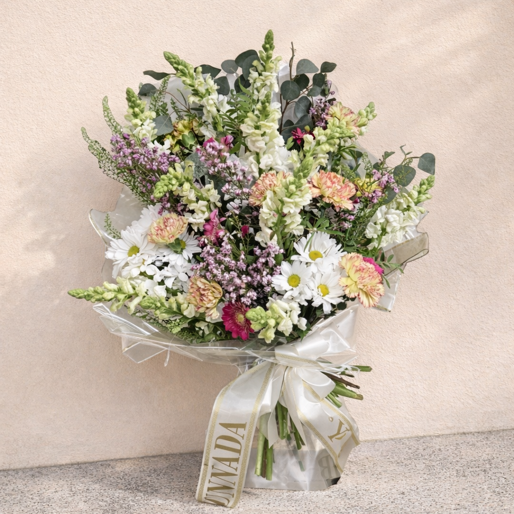 Centro floral realizado con flor primaveral. Trabajamos con flor de temporada, con armonía de color.
