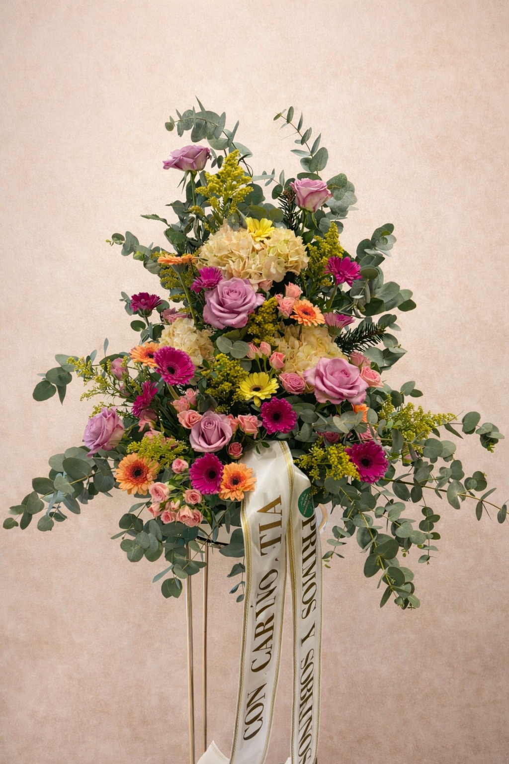 Centro funerario elaborado con flores naturales de temporada. Una composición vertical equilibrada, con rosas, gerberas y flores seleccionadas, acompañadas de verdes naturales.