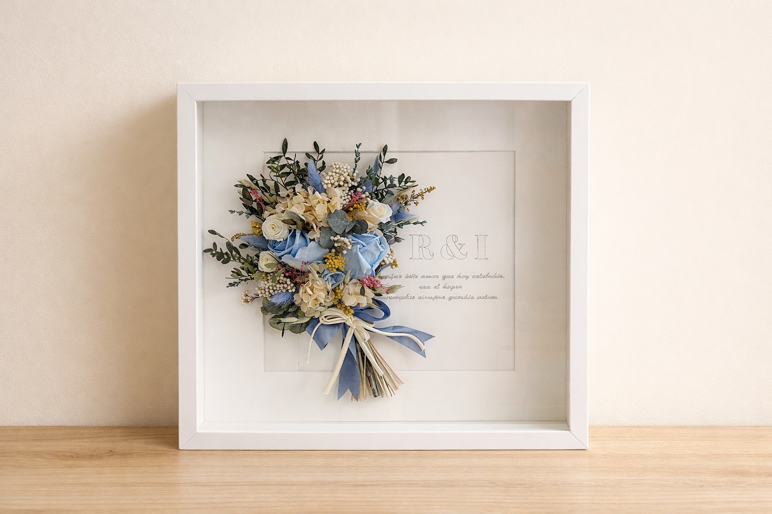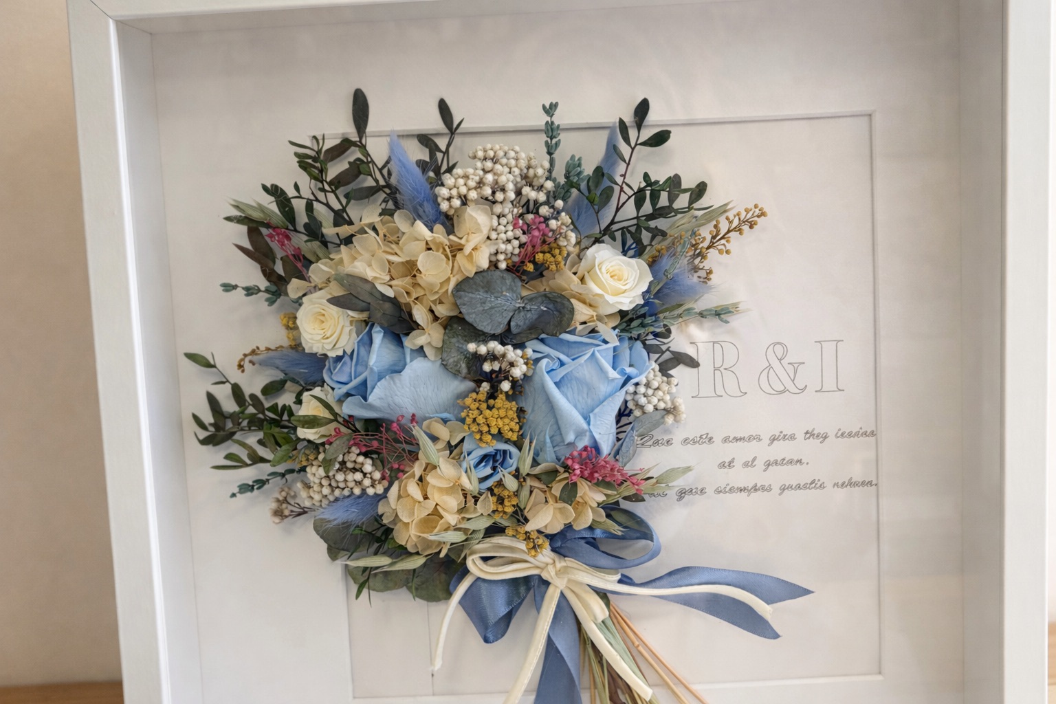 Cuadro elaborado con un bonito ramo de flor seca y preservada, son flores que duran en el tiempo, un regalo diferente que lo mantendrá años.