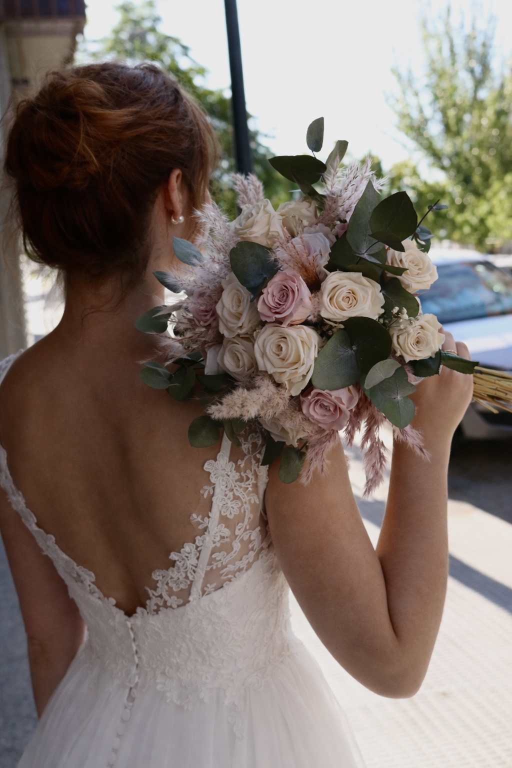 Elegante, delicado, elaborado con rosas preservada, lagurus, son flores que duran en el tiempo, tonalidades rosados y pastel y verdes.