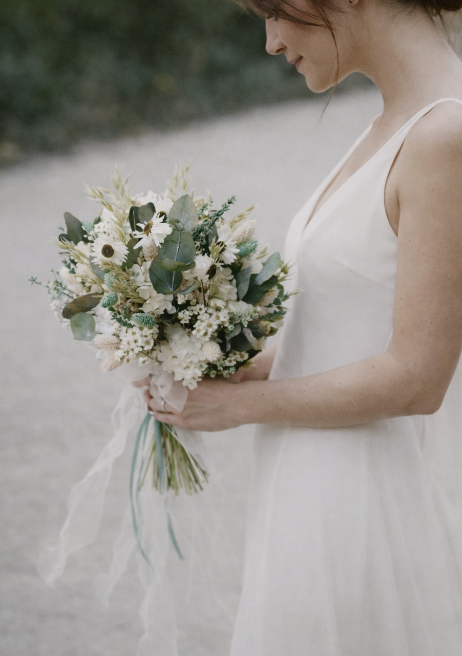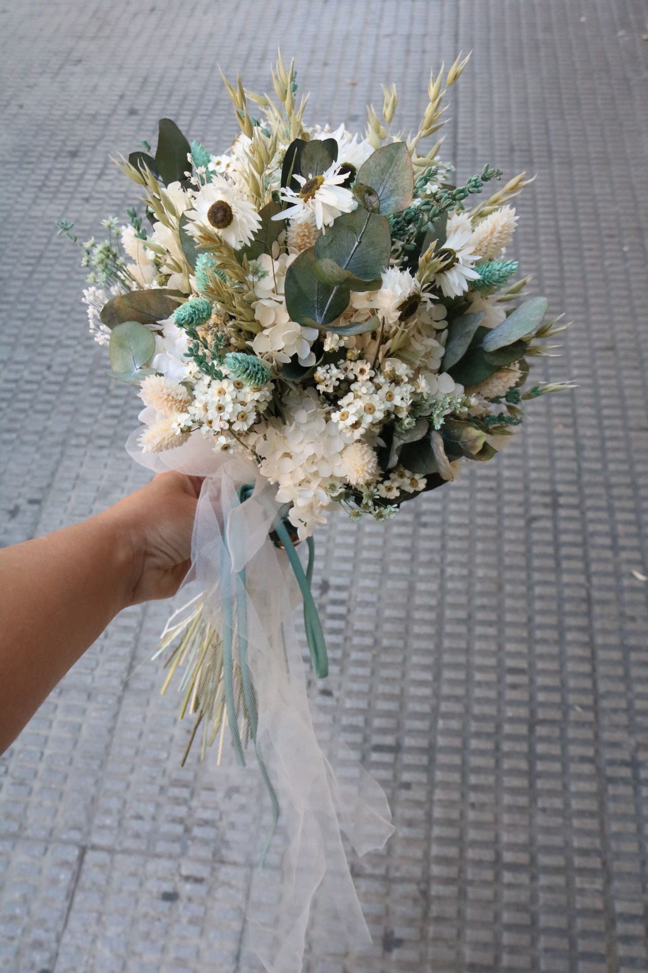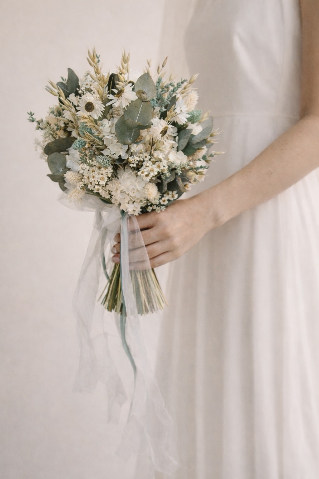 Ramo de novia en tonos blancos verdes y toque de azul, de estilo natural y ligero. Compuesto por flores preservadas como manzanilla, hortensia, paniculata y pequeñas flores silvestres, combinadas con eucalipto y espigas.