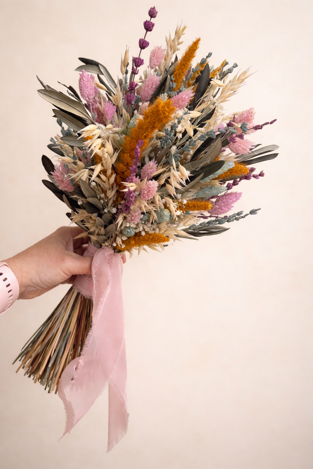 Los colores combinan matices rosados, mostaza, beige, verdes y toques malva, aportando un estilo natural y atemporal. Está terminado con tallos vistos y cinta textil en tono rosa empolvado.
