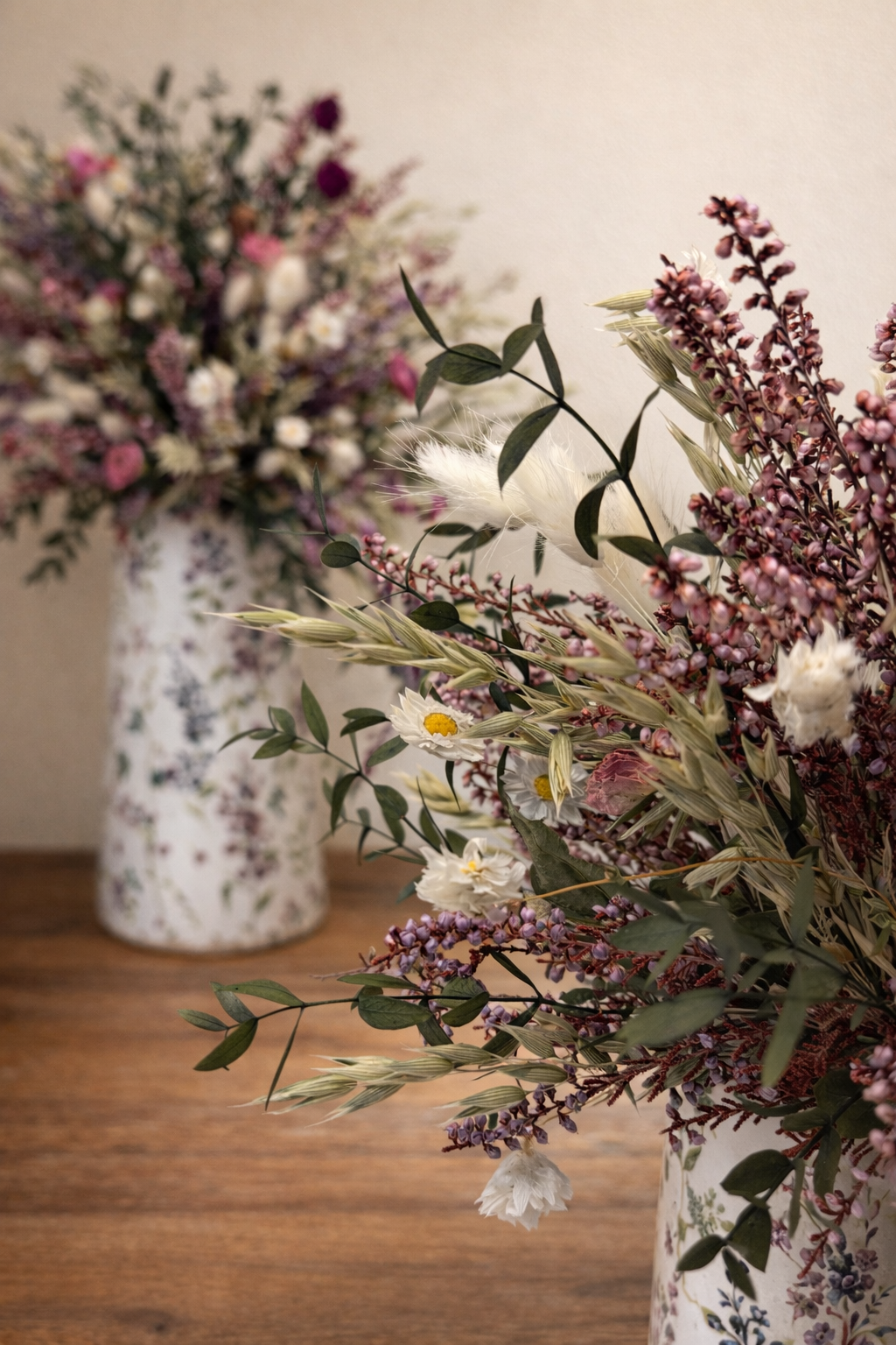 Jarra decorativa con diseño floral, elaborada con, flor seca o artificial. Perfecta para decorar hogares, eventos o escaparates en Zaragoza.