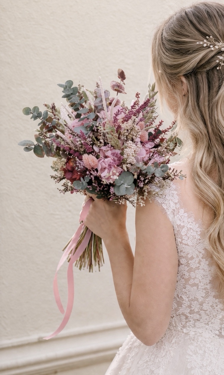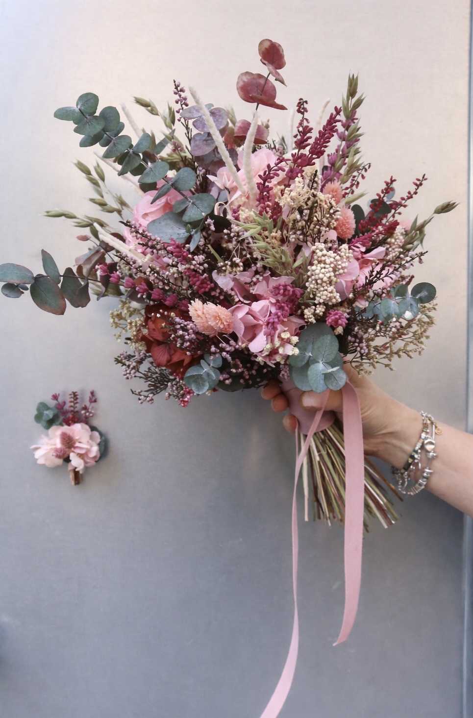 Un ramo que parece recién recogido en un paseo largo por el campo. Mezcla flores preservadas y secas en una paleta que se mueve entre rosas suaves, burdeos y verdes azulados, con texturas ligeras y aireadas.