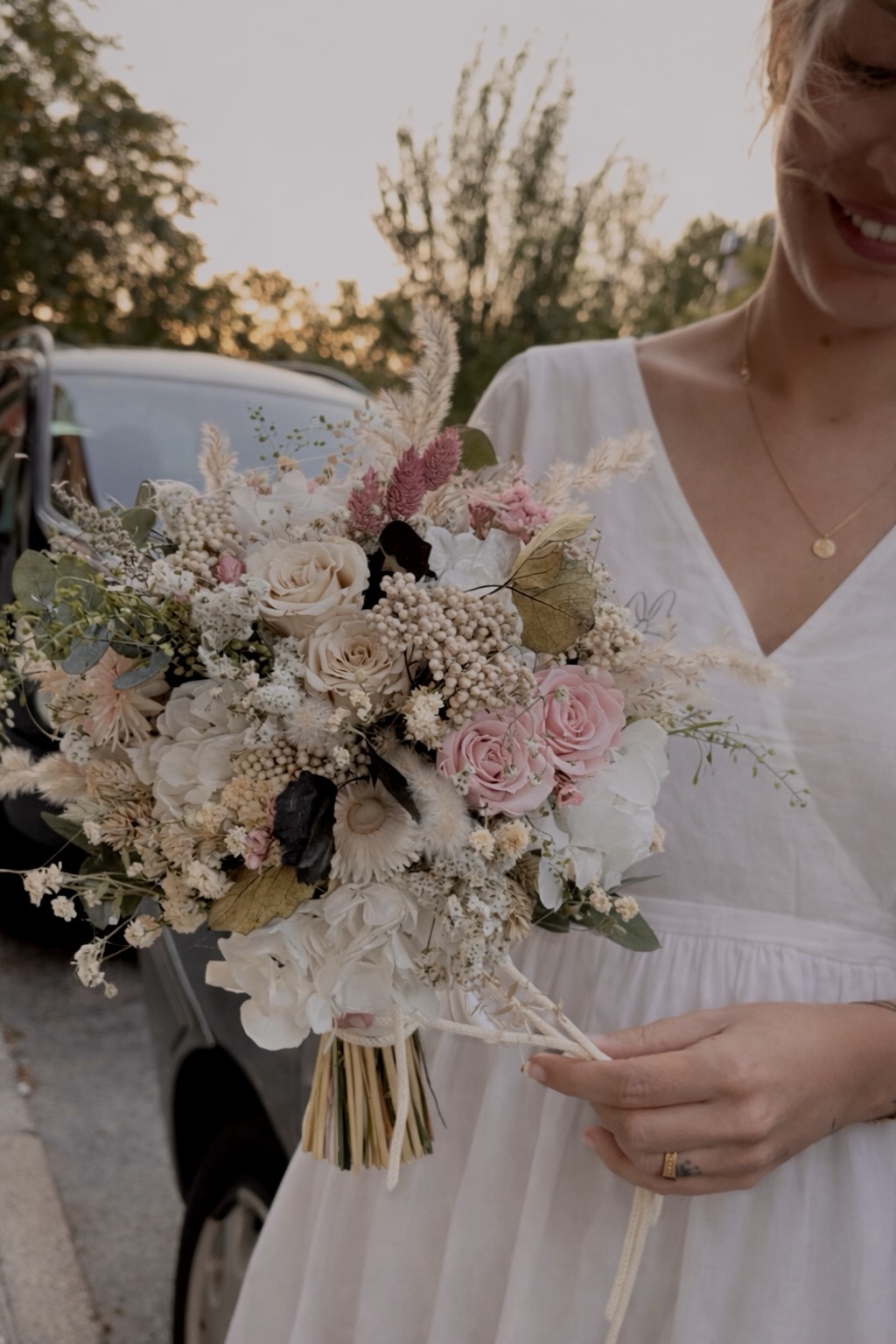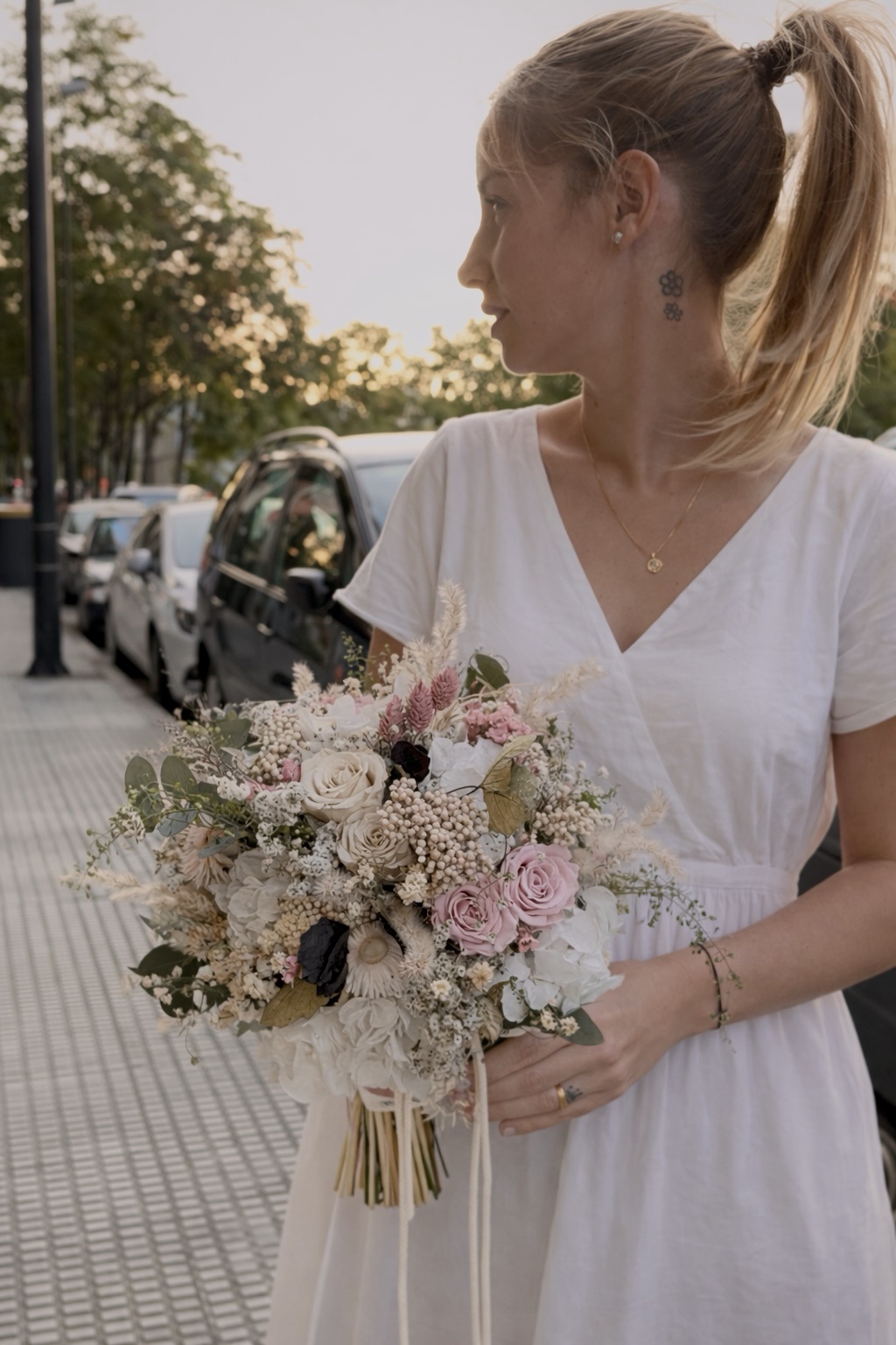 Este diseño mezcla la delicadeza de las flores preservadas en tonos crema y rosa empolvado con pequeños toques verdes y texturas secas que le dan ese aire libre y a su vez súper romántico .