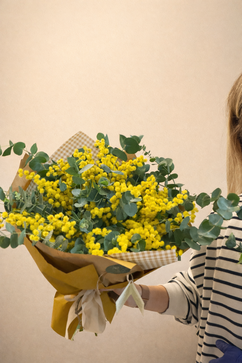 La mimosa es una flor de temporada, es bastante duradera y se puede secar al retirarle el agua, el eucalipto le aporta ese olor tan característico que nos encanta.