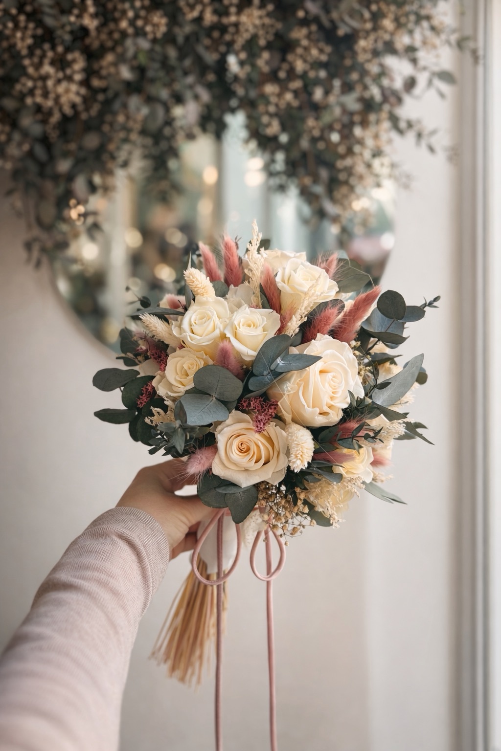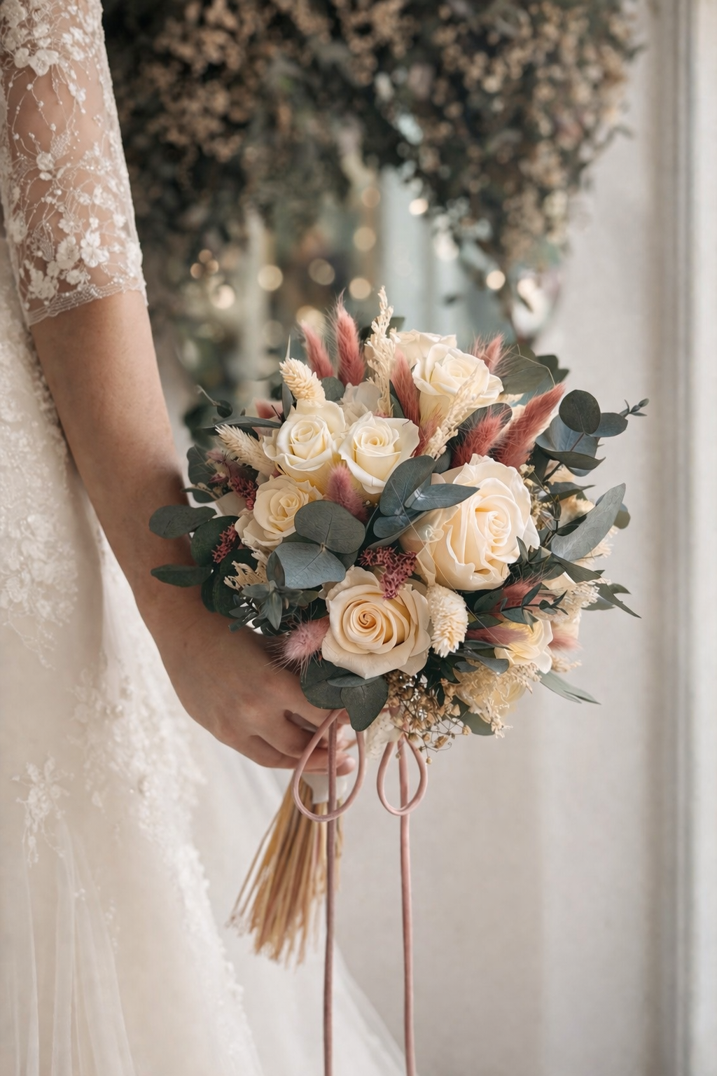 Ramo de novia con rosas, lagurus, hortensias preservadas, diferentes verdes que aportan soltura y movimiento.