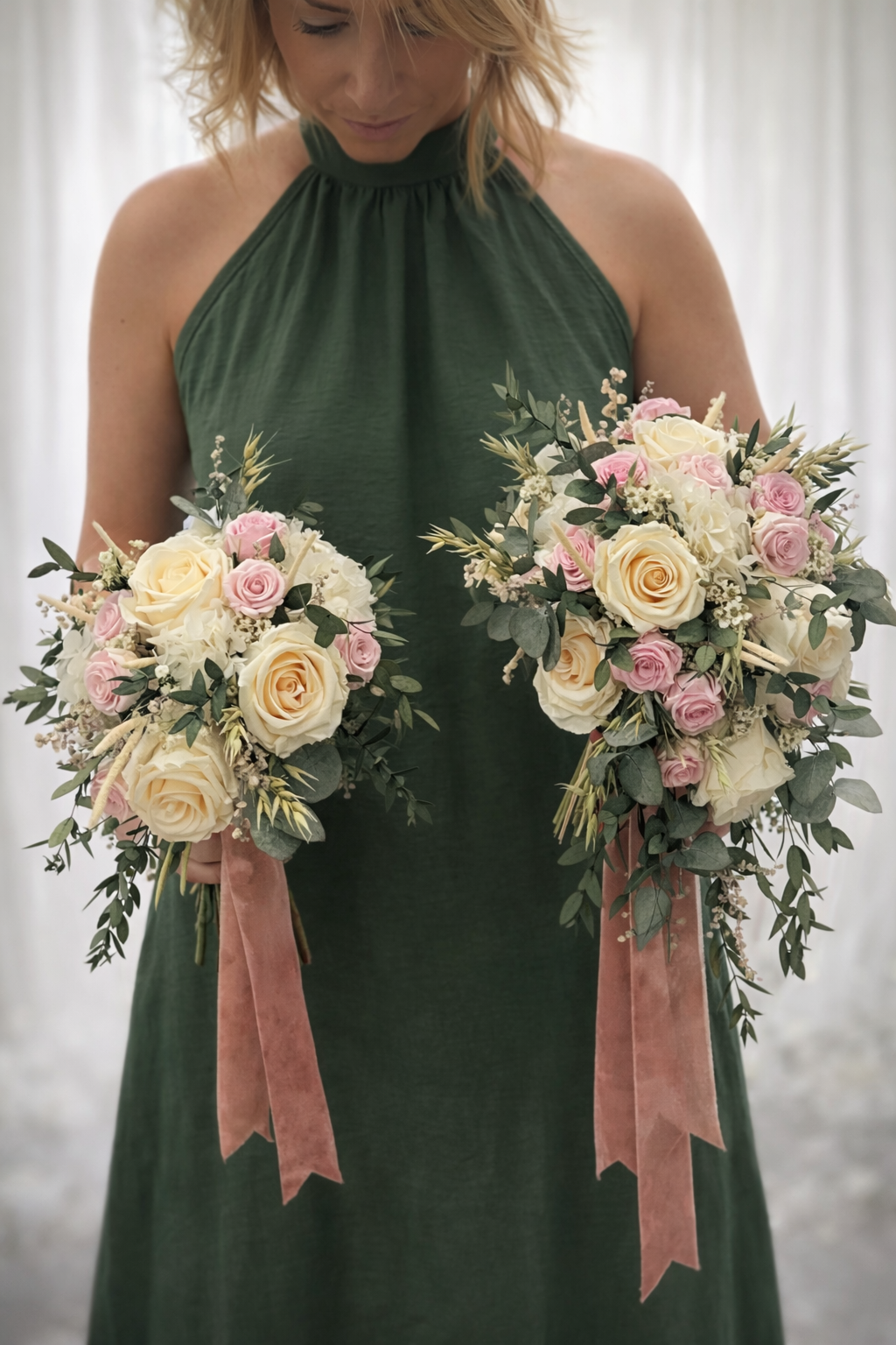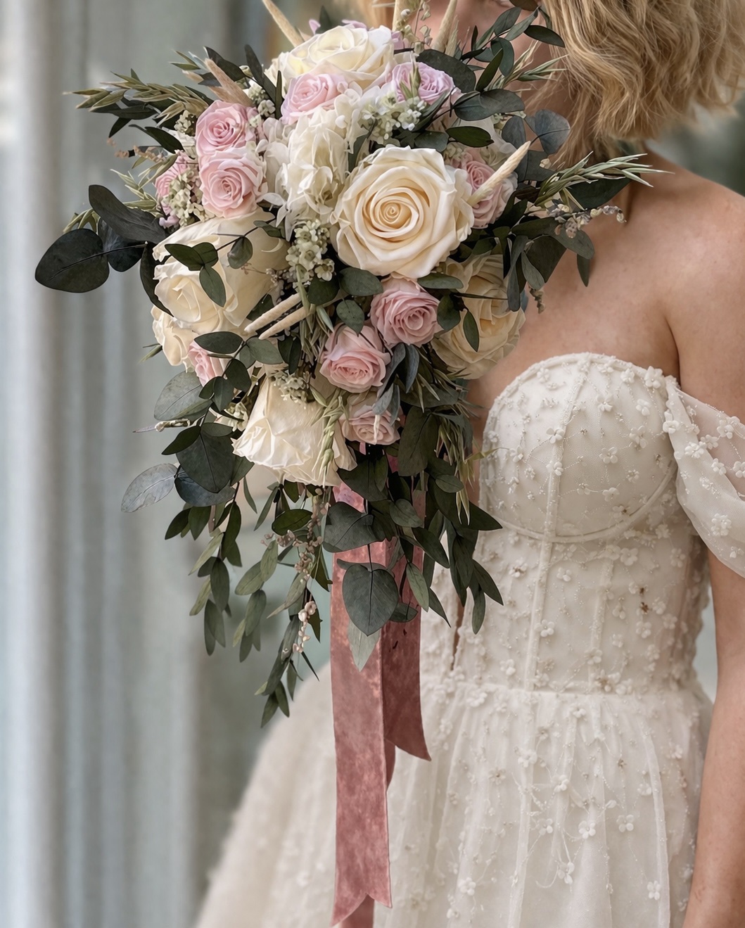Ramo de novia en tonos suaves, compuesto por rosas crema y rosas rosadas, horneáis, acompañado de pequeñas flores blancas y verdes variados. Tiene una forma clásica de gota, con una ligera caída natural, lo que le da movimiento sin perder estructura.