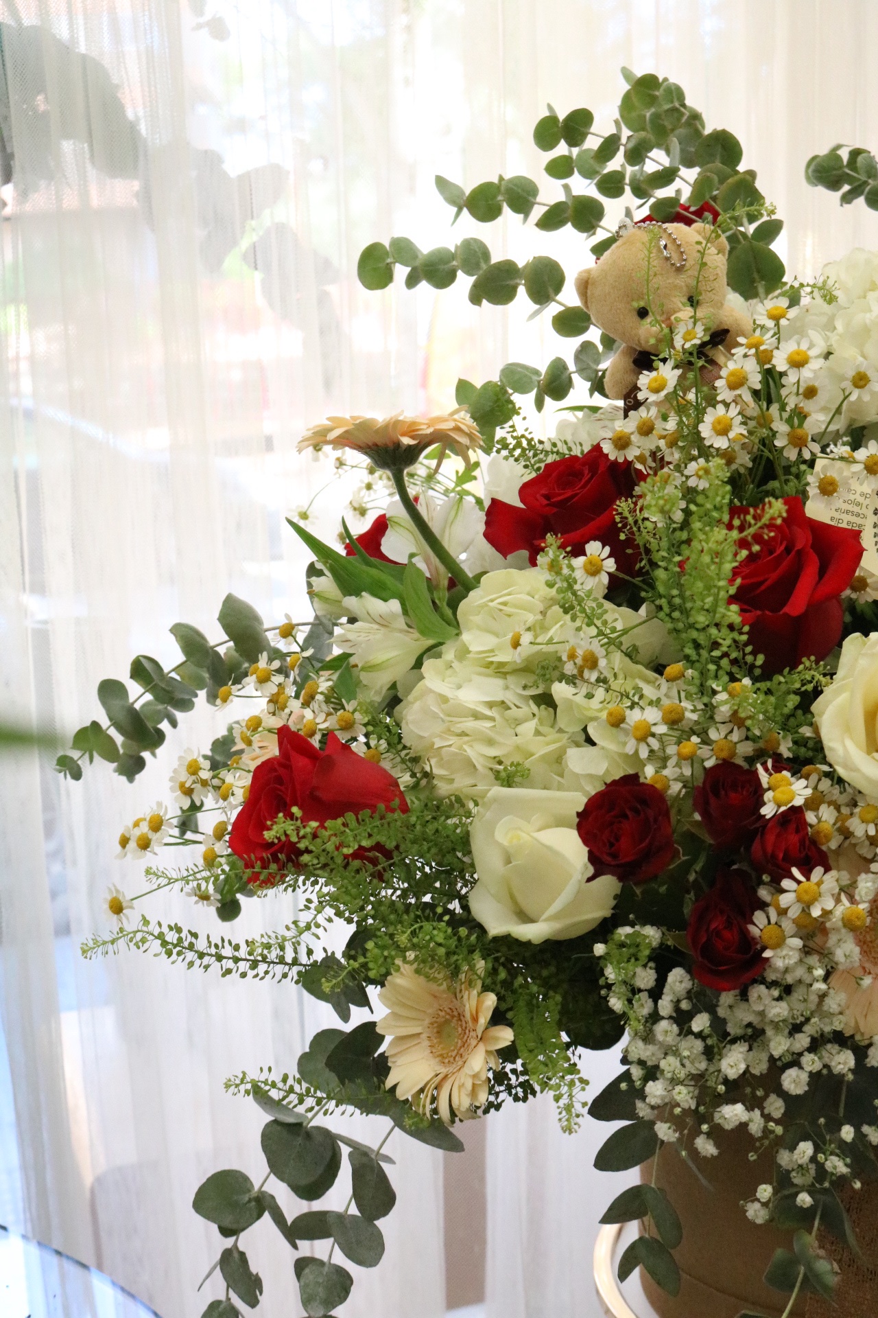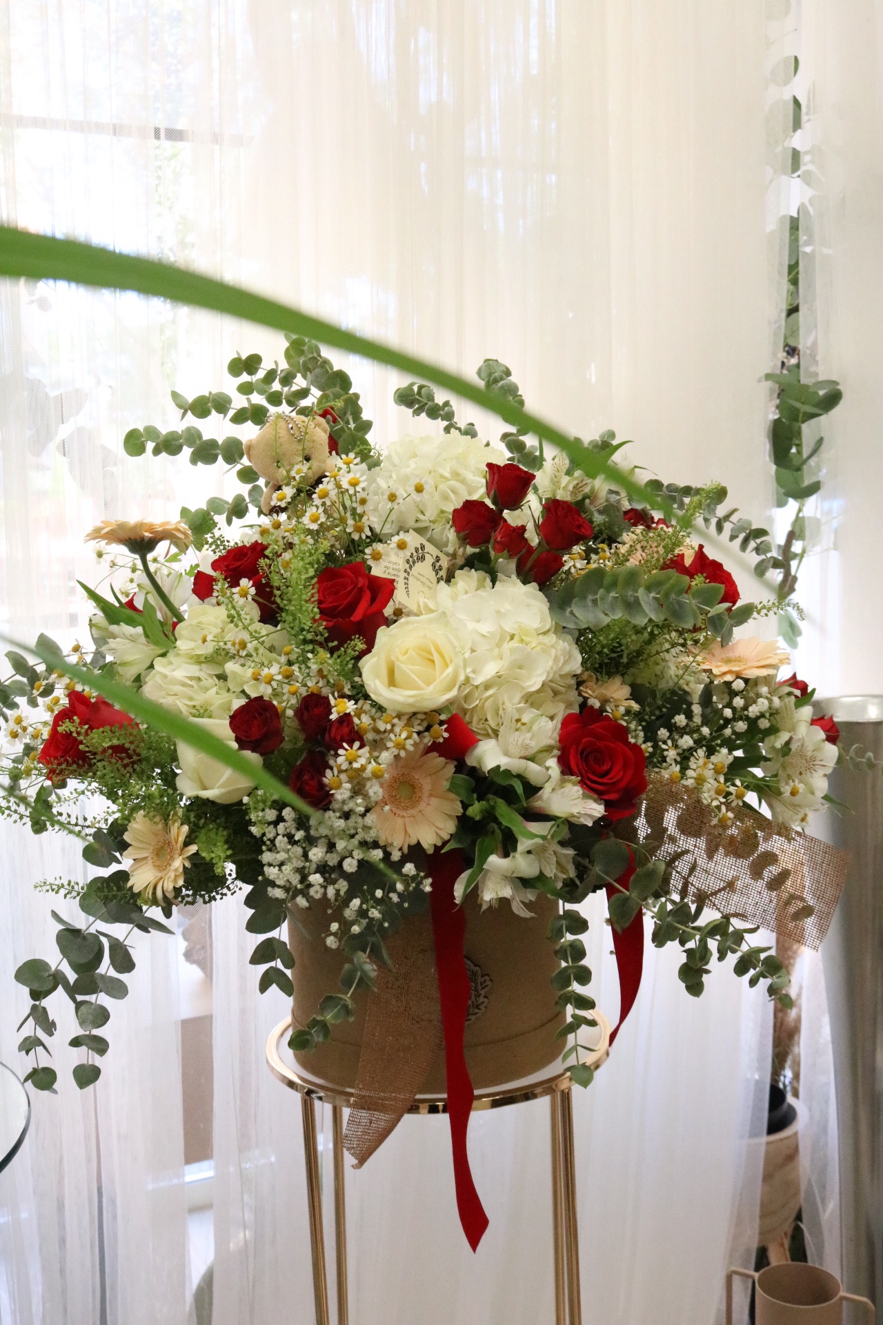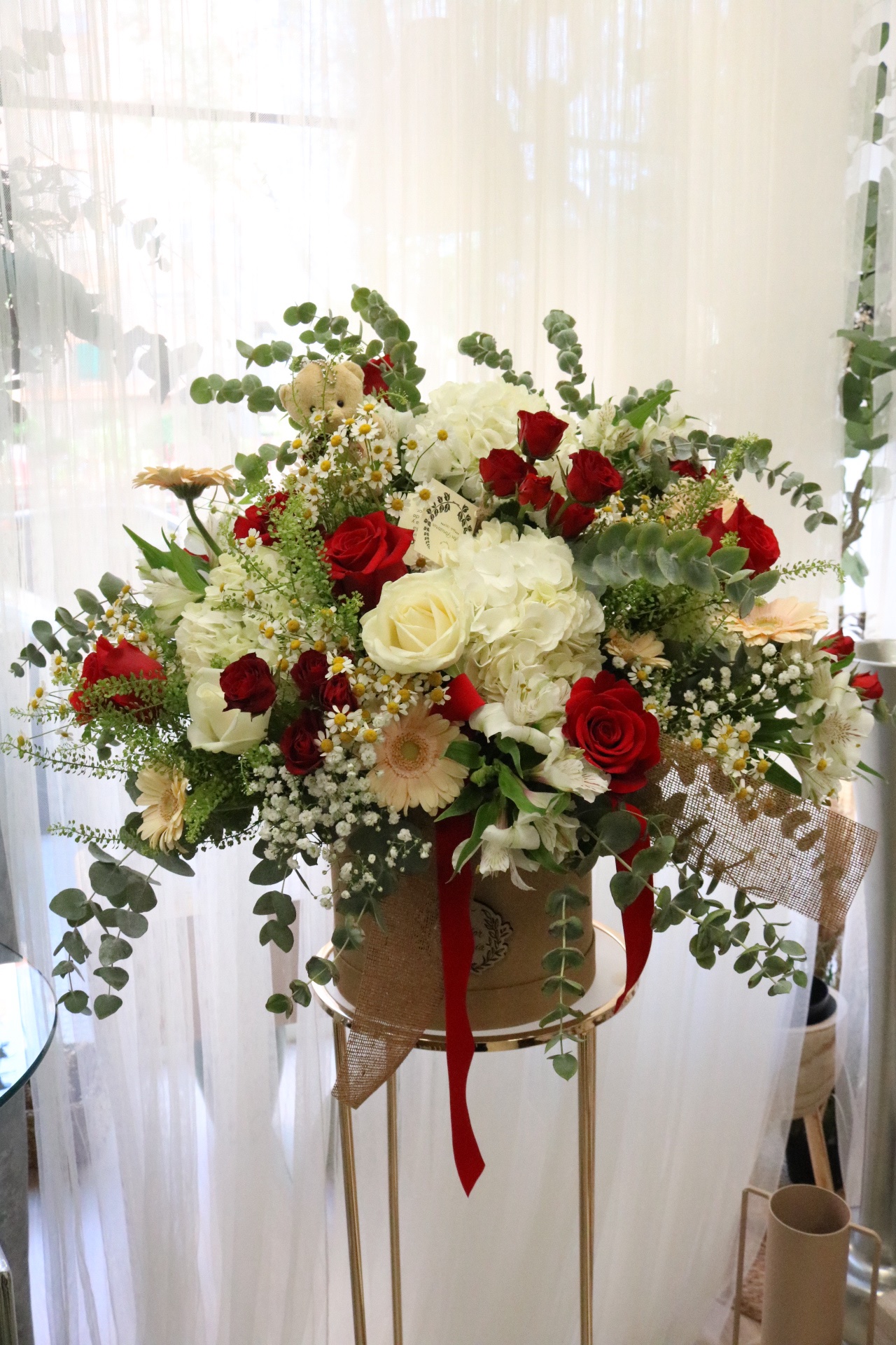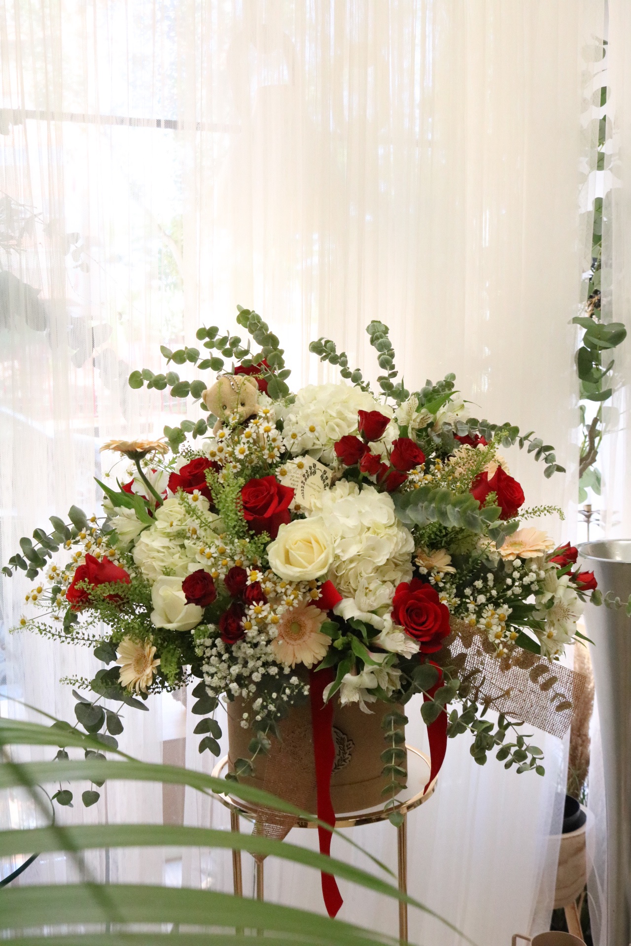 Sombrerera, con rosas rojas, flores blancas, sus verdes y su forma clásica, especial para cualquier ocasión.
