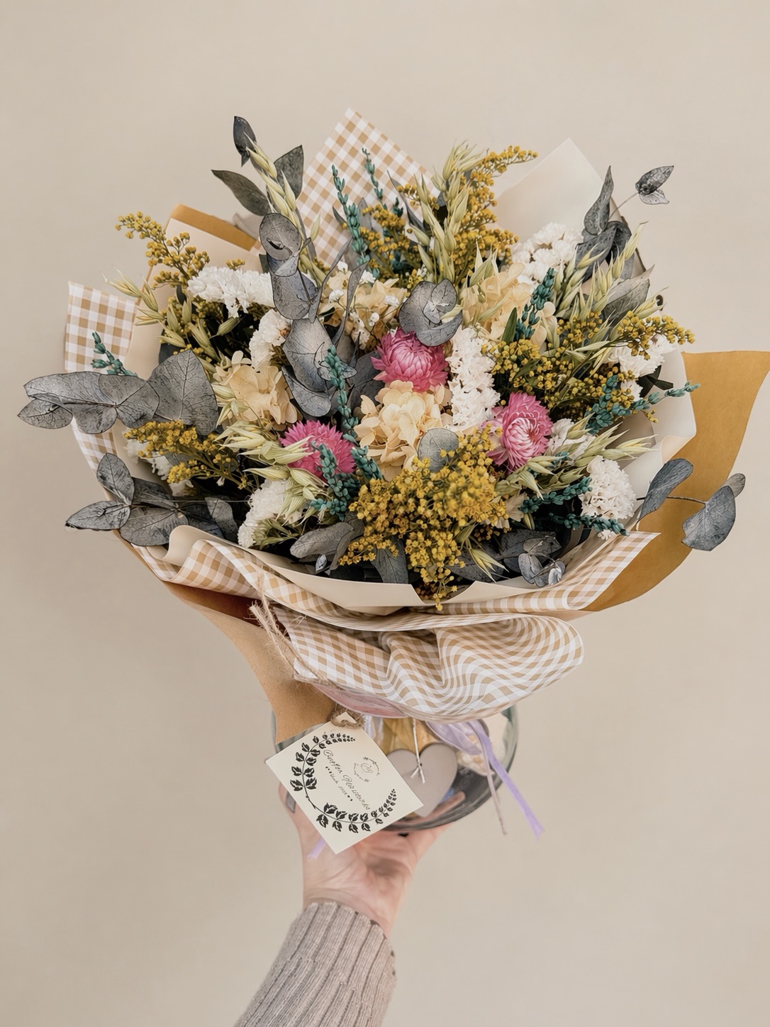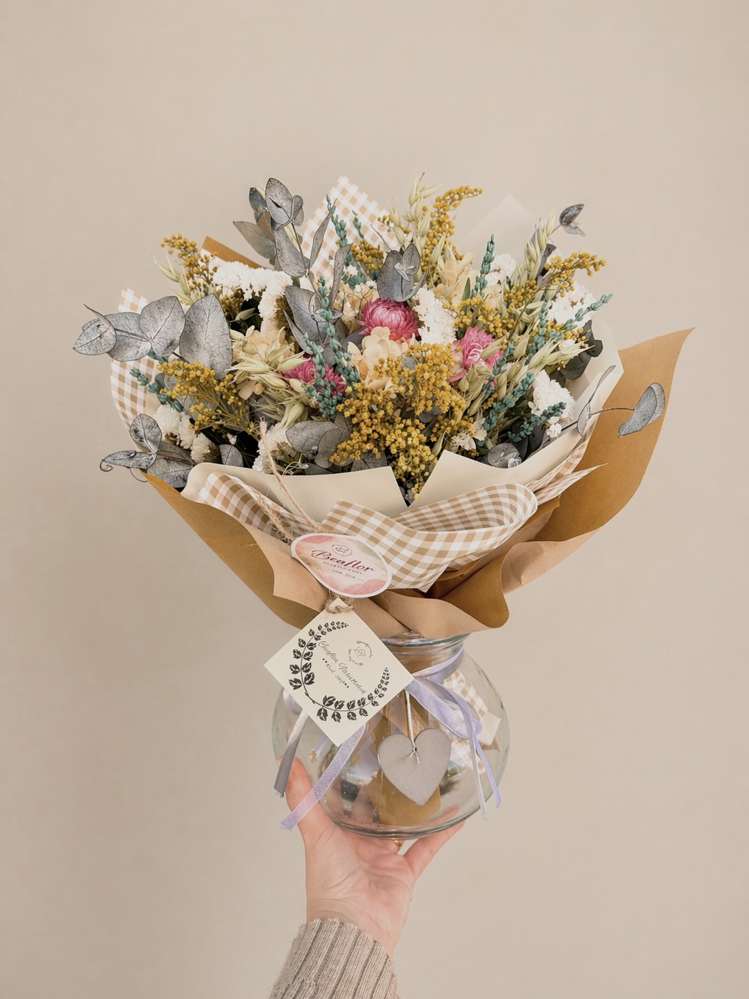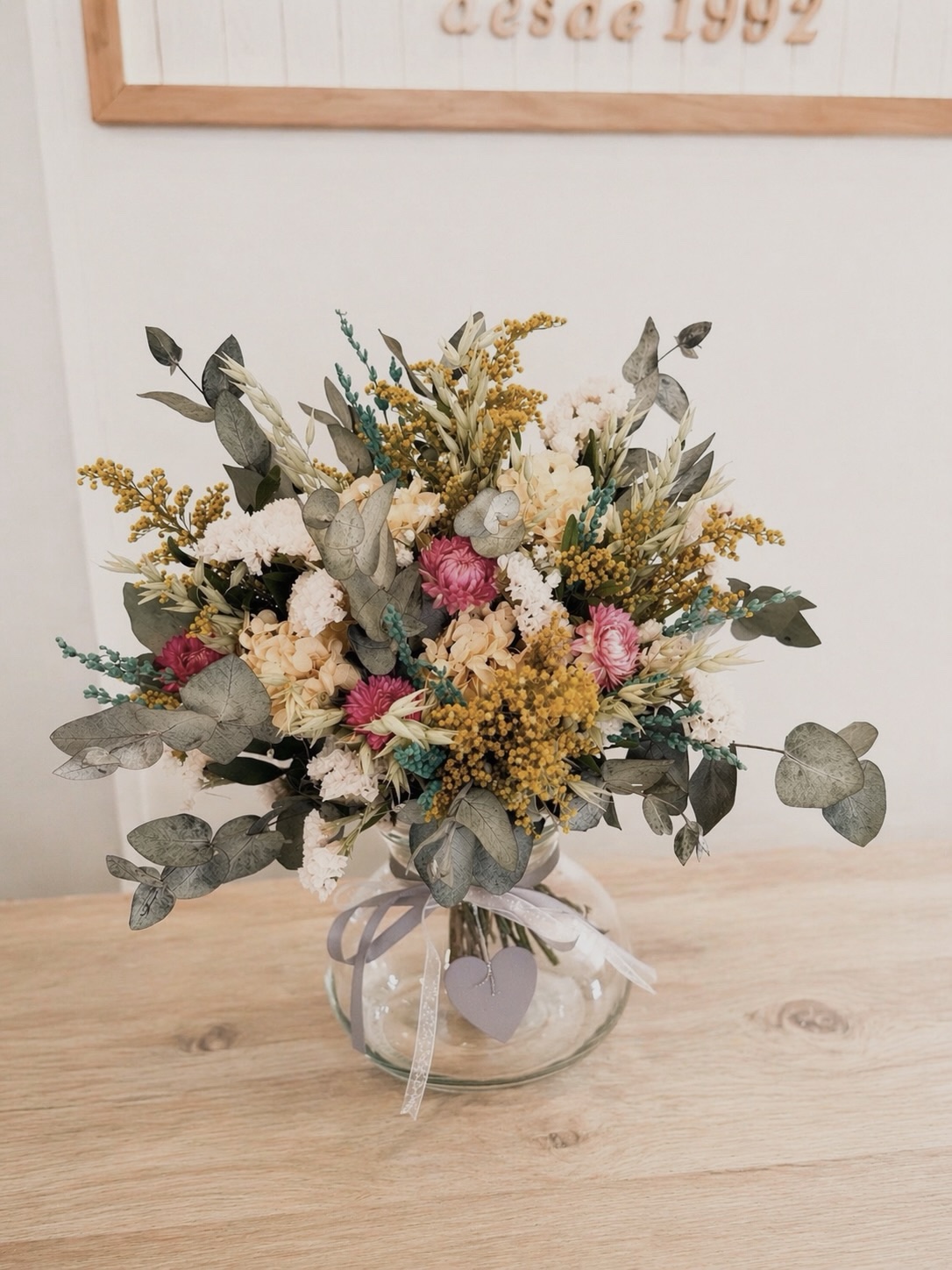 Ramo de estilo campestre elaborado con una selección de flores preservadas y secas en tonos cálidos y suaves. Combina diferentes volúmenes y texturas, creando un conjunto equilibrado y natural.