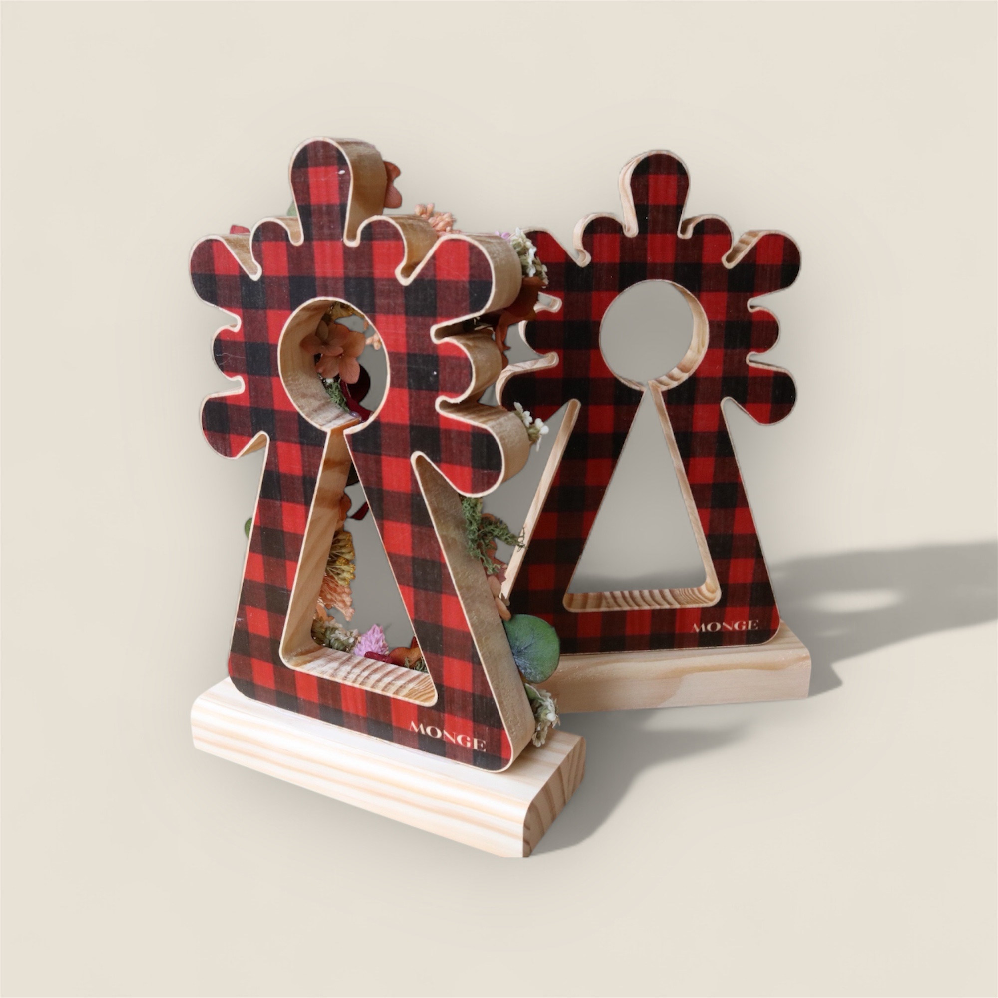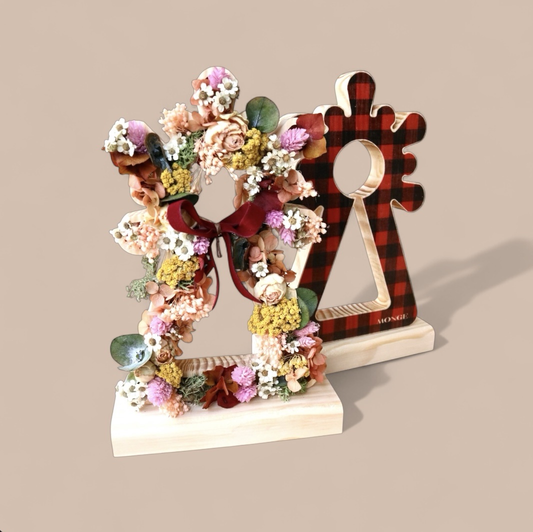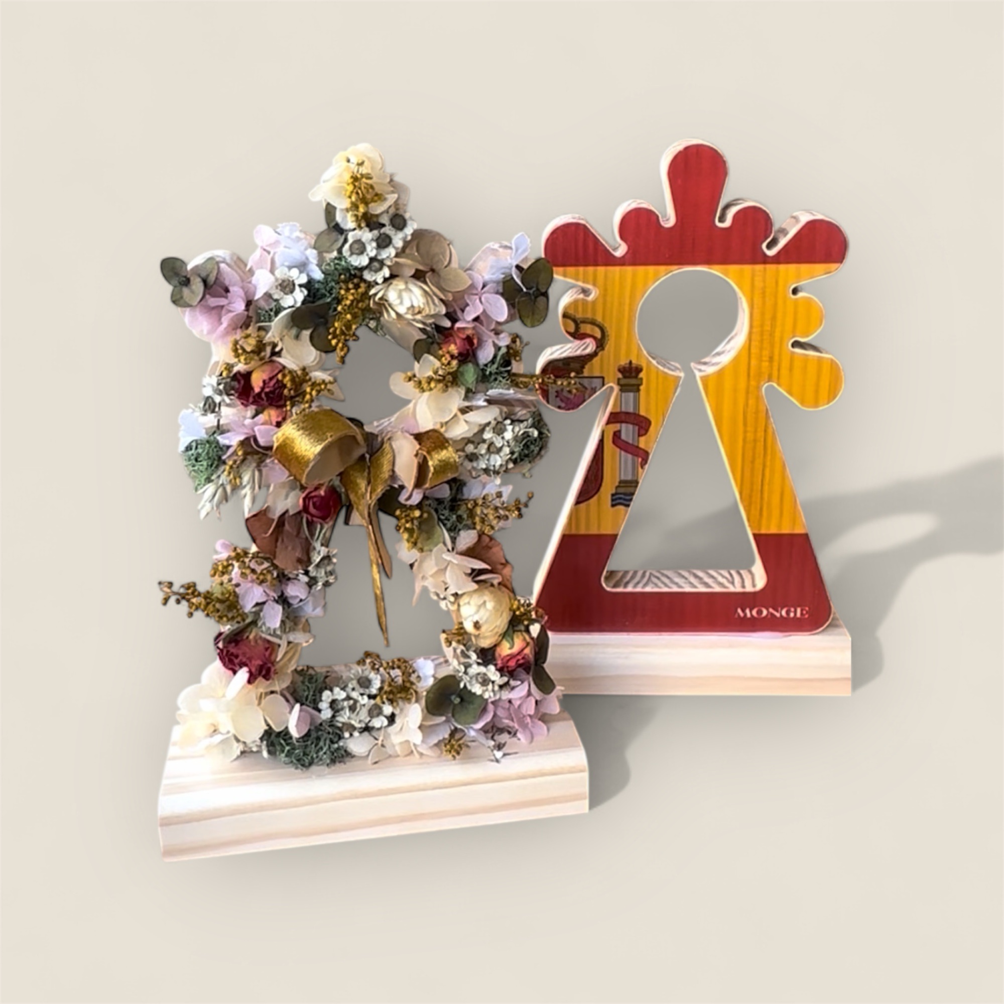 EDICIÓN LIMITADA DE LA silueta de madera de la Virgen del Pilar, una pieza artesanal que combina la calidez de la madera con la delicadeza de flores secas y preservadas, cuidadosamente seleccionadas para garantizar su belleza y durabilidad.